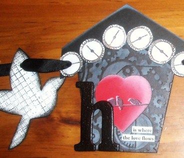 The whole swag has been joined together using black grosgrain with metal heart embellishments at either end and bird cutouts between, coloured using black ink and a textured clear stamp.